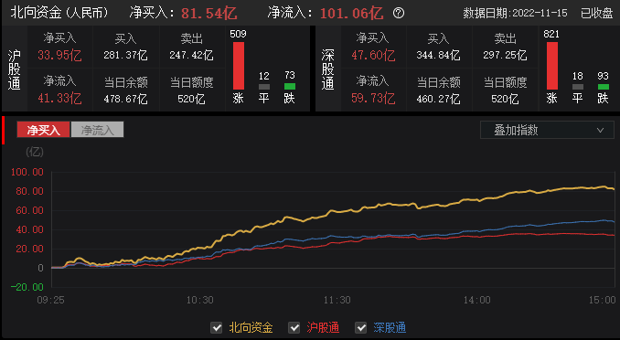 11月15日,北向资金全天大幅净买入81.54亿元,近3日累计加仓近400亿元。