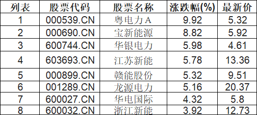 截至09:45,电力行业板块拉升。粤电力A(000539.CN)涨9.92%报5.32元,宝新能源(000690.CN)涨8.82%报5.92元,华银电力(600744.CN)涨5.98%报4.61元,江苏新能(603693.CN)涨5.78%报13.36元,赣能股份(000899.CN)涨5.32%报9.51元,龙源电力(001289.CN)涨5.16%报20.37元,华电国际(600027.CN)涨4.32%报5.8元,浙江新能(600032.CN)涨3.92%报12.73元。