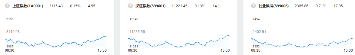 午后市场回暖,三大指数跌幅均缩小,沪指站上3100点。券商板块再度拉升,湘财股份5天4板;信创概念股持续走强,中国长城等涨停。半导体板块继续拉升,普冉股份等涨超10%。新冠药概念股延续强势,以岭药业涨停,股价创历史新高。整体看,个股涨多跌少,两市超2700股上涨。截止收盘,沪指跌0.15%,深成指跌0.13%,创业板指跌0.71%。沪深两市今日成交9031亿元。板块方面,医药商业、中药、数据安全等板块涨幅居前,煤炭、有色、汽车整车等板块跌幅居前。