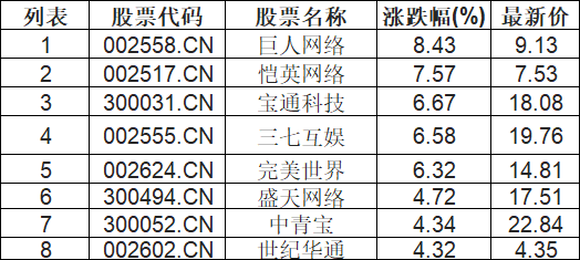 截至09:45,游戏板块拉升。掌趣科技(300315.CN)涨13.85%报3.7元,大晟文化(600892.CN)涨10.00%报5.17元,巨人网络(002558.CN)涨8.55%报9.14元,恺英网络(002517.CN)涨7.57%报7.53元,神州泰岳(300002.CN)涨7.04%报5.02元,宝通科技(300031.CN)涨6.67%报18.08元,三七互娱(002555.CN)涨6.58%报19.76元,完美世界(002624.CN)涨6.32%报14.81元。