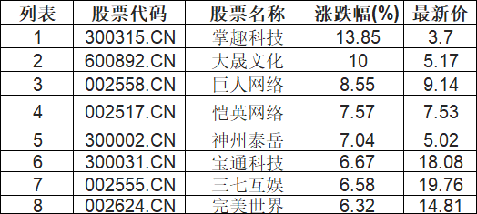 游戏板块拉升,掌趣科技(300315.CN)涨13.85%