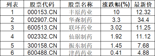 地塞米松板块拉升,丰原药业(000153.CN)涨10.0%