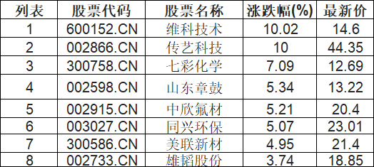 截至10:30,钠离子电池板块拉升。维科技术(600152.CN)涨10.02%报14.6元,传艺科技(002866.CN)涨10.00%报44.35元,七彩化学(300758.CN)涨7.09%报12.69元,山东章鼓(002598.CN)涨5.34%报13.22元,中欣氟材(002915.CN)涨5.21%报20.4元,同兴环保(003027.CN)涨5.07%报23.01元,美联新材(300586.CN)涨4.95%报21.4元,雄韬股份(002733.CN)涨3.74%报18.85元。
