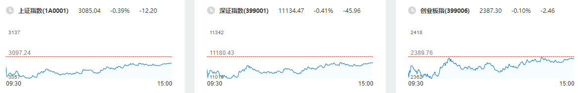 截至收盘,沪指跌0.39%报3085.04点,深成指跌0.41%报11134.47点,创业板指跌0.1%报2387.3点,上证50指数跌1.25%,北证50指数涨2.55%;两市合计成交8452亿元,北向资金净卖出20.46亿元。