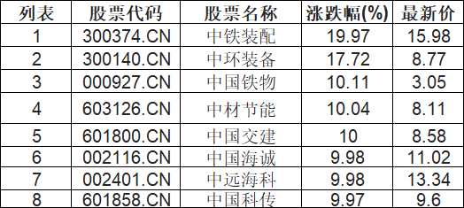截至10:15,中字头板块拉升。中铁装配(300374.CN)涨19.97%报15.98元,中环装备(300140.CN)涨17.72%报8.77元,中国铁物(000927.CN)涨10.11%报3.05元,中材节能(603126.CN)涨10.04%报8.11元,中国交建(601800.CN)涨10.00%报8.58元,中国海诚(002116.CN)涨9.98%报11.02元,中远海科(002401.CN)涨9.98%报13.34元,中国科传(601858.CN)涨9.97%报9.6元。
