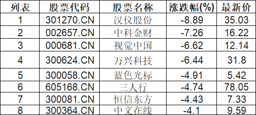 AIGC概念板块下挫,汉仪股份(301270.CN)跌8.89%