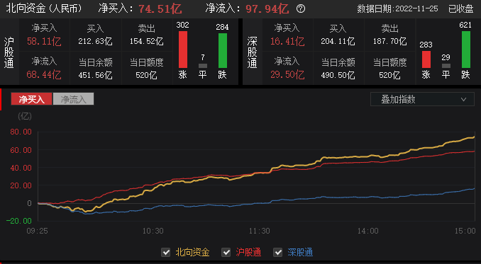 北向资金全天净买入74.51亿元,其中,沪股通净买入58.11亿元,深股通净买入16.41亿元。