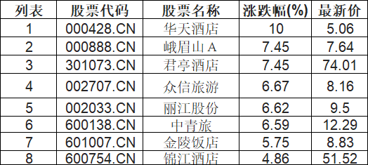 截至13:15,旅游酒店板块拉升。华天酒店(000428.CN)涨10.00%报5.06元,峨眉山A(000888.CN)涨7.45%报7.64元,君亭酒店(301073.CN)涨7.45%报74.01元,众信旅游(002707.CN)涨6.67%报8.16元,丽江股份(002033.CN)涨6.62%报9.5元,中青旅(600138.CN)涨6.59%报12.29元,金陵饭店(601007.CN)涨5.75%报8.83元,锦江酒店(600754.CN)涨4.86%报51.52元。