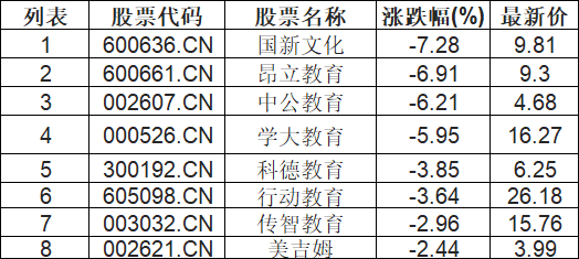 教育板块下挫,国新文化(600636.CN)跌7.28%