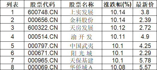 截至13:15,房地产开发板块拉升。上实发展(600748.CN)涨10.14%报3.8元,金科股份(000656.CN)涨10.14%报2.39元,天房发展(600322.CN)涨10.12%报2.72元,渝 开 发(000514.CN)涨10.11%报4.9元,中国武夷(000797.CN)涨10.10%报4.25元,阳 光 城(000671.CN)涨10.10%报2.29元,天保基建(000965.CN)涨10.10%报5.78元,华侨城A(000069.CN)涨10.08%报5.57元。