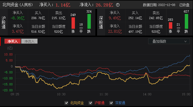 北向资金全天小幅净买入1.14亿元,其中沪股通净卖出8.36亿元,深股通净买入9.49亿元。
