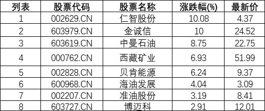 截至13:30,采掘行业板块拉升。仁智股份(002629.CN)涨10.08%报4.37元,金诚信(603979.CN)涨10.00%报24.52元,中曼石油(603619.CN)涨8.75%报22.75元,西藏矿业(000762.CN)涨6.93%报51.99元,贝肯能源(002828.CN)涨6.24%报9.37元,海油发展(600968.CN)涨4.04%报3.09元,准油股份(002207.CN)涨3.19%报8.41元,博迈科(603727.CN)涨2.91%报12.01元。
