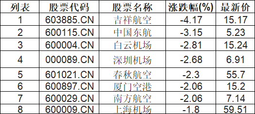 航空机场板块低开,吉祥航空(603885.CN)跌4.17%