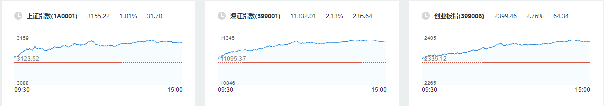 5日,A股三大指数高开高走,沪指涨逾1%,日线四连阳;创业板指盘中重返2400点,为2022年12月13日以来首次。截至收盘,沪指涨1.01%,报3155.22点;深成指涨2.13%,报11332.01点;创业板指涨2.76%,报2399.46点。两市成交额8427亿元,较上个交易日放量590亿元。