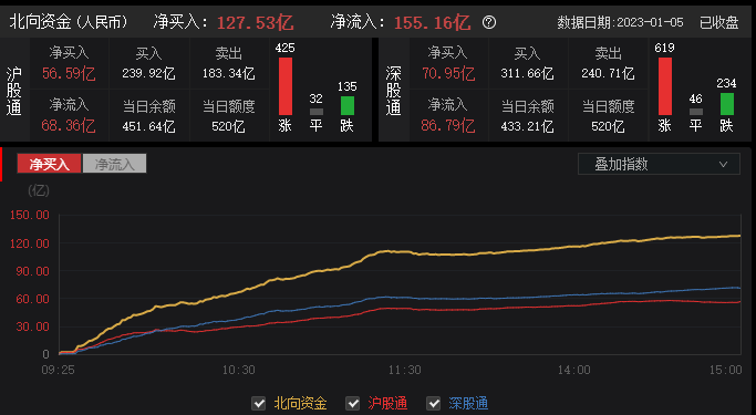 北向资金全天单边净买入127.53亿元,创2022年11月14日以来新高;其中沪股通净买入56.59亿元,深股通净买入70.95亿元。