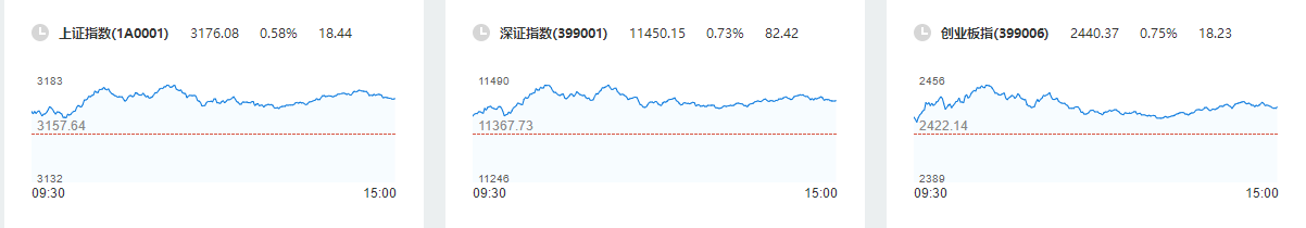大盘全天红盘震荡,沪指录得6连阳,创业板指冲高回落。截至收盘,上证指数涨0.58%,报3176.08点;深证成指涨0.73%,报11450.15点;创业板指涨0.75%,报2440.37点。两市成交额8072亿元,较上个交易日缩量308亿元。