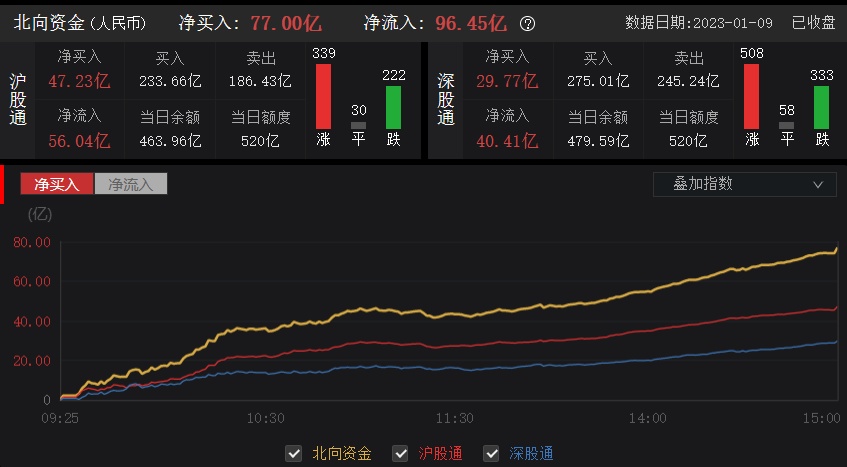 北向资金全天净流入超96亿元,其中沪股通流入超56亿元,深股通流入超40亿元。