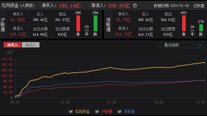 北向资金全天大幅净买入186.14亿元;其中沪股通净买入94.35亿元,深股通净买入91.79亿元。主力资金尾盘持续净流入计算机、汽车、电子、食品饮料等板块,净流出医药生物、非银金融、银行、交通运输等板块。具体到个股来看,科大讯飞、舍得酒业、拓尔思、东山精密、比亚迪别获净流入10.88亿元、10.04亿元、7.95亿元、6.25亿元、5.55亿元。净流出方面,中国中免、隆基绿能、复星医药、赣锋锂业、通威股份分别遭净流出9.84亿元、6.04亿元、5.55亿元、5.05亿元、4.27亿元。