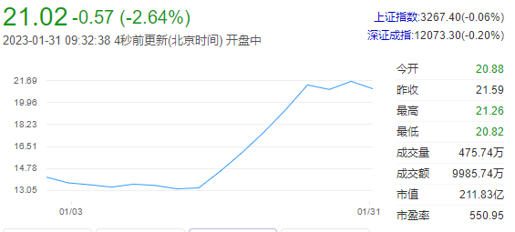 农历兔年首个交易日,A股三大指数集体高开后震荡回落。沪指3300点关口得而复失。深证成指、创业板指则相对强势,沪深两市成交额重返万亿元上方。截至收盘,上证指数报3269.32点,上涨0.14%;深证成指报12097.76点,上涨0.98%;创业板指报2613.89点,上涨1.08%。沪深两市合计成交10621亿元。外资延续做多态势,北向资金全天单边流入,收盘净买入186.14亿,创2021年12月以来最大单日净买入额。2023年以来,北向资金已累计净买入超1300亿元。