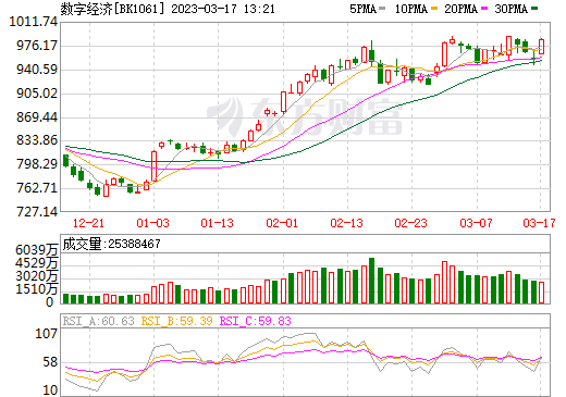 信创、大数据等数字经济概念再度走强,截至发稿,海天瑞声大涨超18%,盘中一度“20cm”涨停;彩讯股份涨近16%,盛天网络、易点天下涨超12%,蓝色光标、凌志软件、汉得信息、同花顺等涨超10%,神州数码、联络互动、工业富联涨停,当虹科技、科大讯飞等涨超7%。