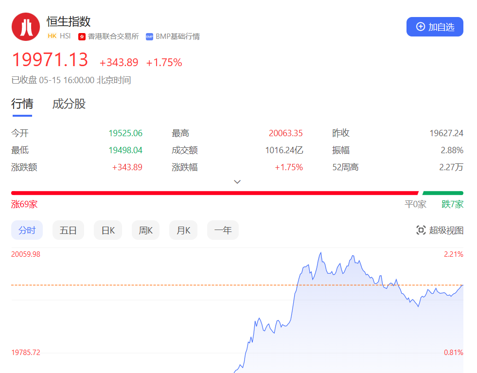 香港恒生指数开盘跌0.52%,早盘恒指呈窄幅震荡走势,午后拉升走高,一度重返两万点关口,尾盘涨幅则略有收窄。截至收盘,恒生指数涨1.75%或343.89点,报19971.13点,全日成交额1016.24亿港元;恒生国企指数涨1.75%,报6780.08点;恒生科技指数涨1.33%,报3925.5点。