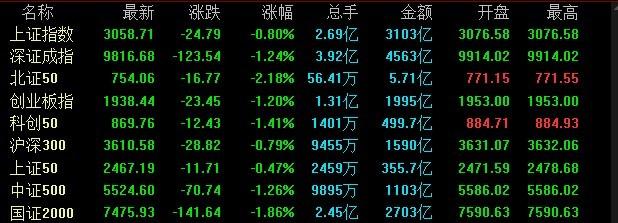 A股三大指数上一个交易日集体收跌,截至收盘,沪指跌0.8%,深成指跌1.24%,北证50跌2.18%,创业板指跌1.2%,沪深两市成交额7666亿元。两市超4700只个股下跌,北向资金净卖出11.6亿元。板块题材上,转基因、华为汽车、证券等板块逆市上涨;创新药、英伟达概念股跌幅居前。