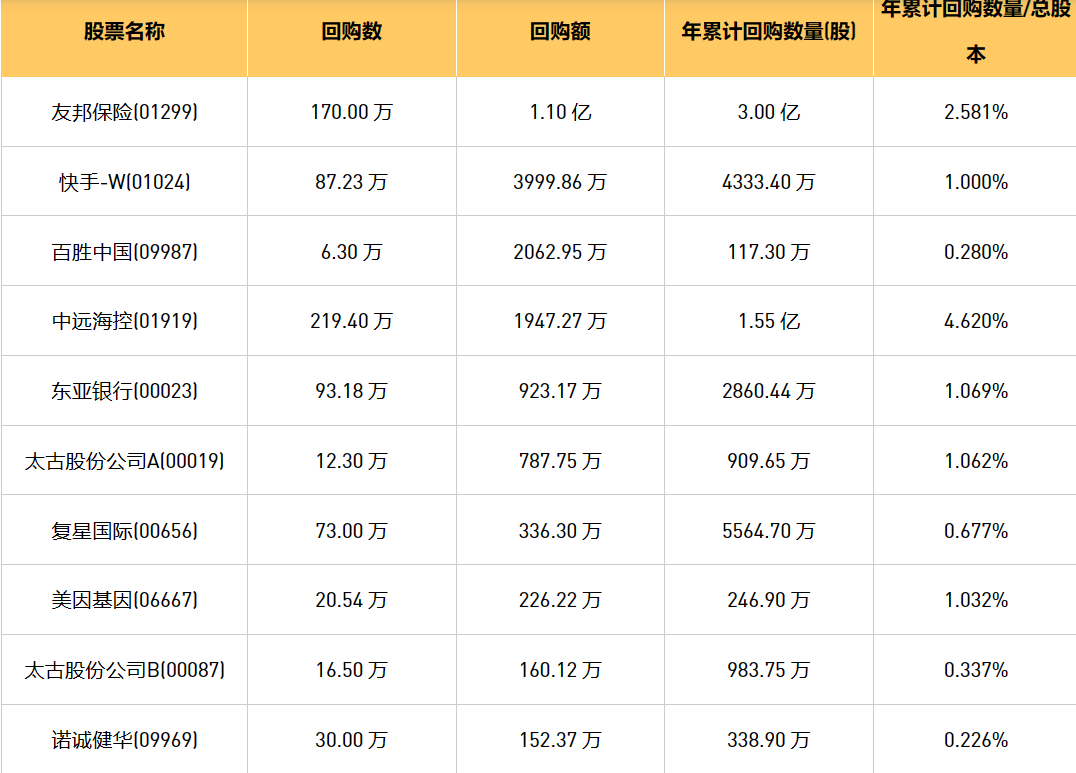 2月26日港股回购概况:DYNAM JAPAN(06889)、天鸽互动(01980)、友和集团(02347)、微泰医疗-B(02235)、东亚银行(00023)、中远海控(0)、亚洲联合基建控股(00711)、诺诚健华(09969)、友邦保险(01299)、首程控股(00697)、复星国际(00656)、清科创业(01945)、太古股份公司A(00019)、太古股份公司B(00087)、快手-W(01024)、美因基因(06667)、乐声电子(00213)、百胜中国(09987)于2024年2月23日进行了回购。其中,回购金额最大的为友邦保险(01299),回购数量170.00 万,回购金额1.10 亿元。