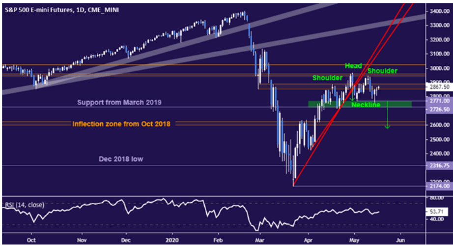 标普500指数在跌破始于3月低点以来的上升趋势线后,可能正在构筑头肩顶形态,若日线收盘跌破2726.50-2771.00(该区间也在头肩顶的颈线位附近)则确认看跌趋势。