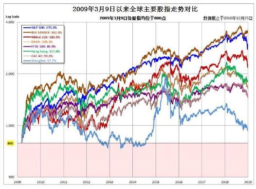 下图为2009年3月以来全球主要股指走势对比