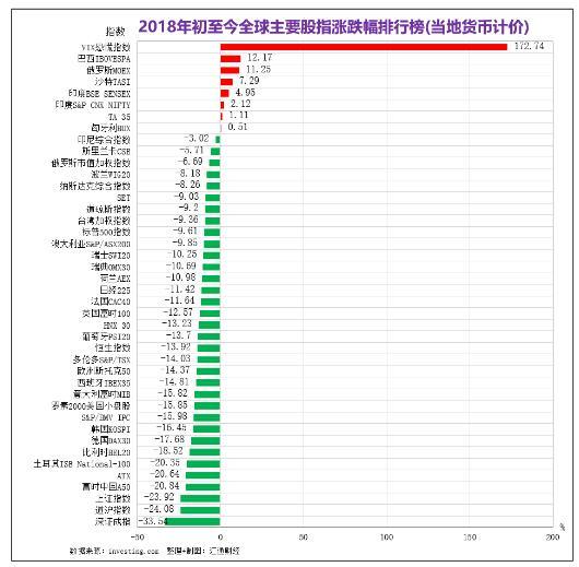 下图为2018年全球主要股市涨跌排行一览(数据截止2018年12月22日):