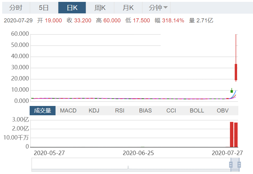 7月29日(周三)美股盘初,柯达(KODK.US)股价延续昨日涨势,开盘涨逾130%,触及熔断。截至21:42,该股报19.79美元。