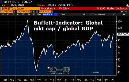“全球股票市场达到了一个新的里程碑。自2018年以来,目前所有股票的价值首次超过全球GDP的100%。依据‘巴菲特指标’,市值占GDP比率大于100%意味着股市处于泡沫区域。”