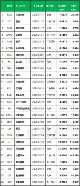 截止至2020年10月1日,共有26家中国企业在美国IPO上市(不考虑SPAC、OTC上市),共募资82.37亿美元。其中5家在美国纽交所上市,21家在纳斯达克上市。