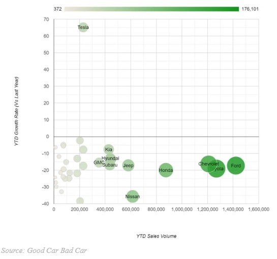 而从下面的图表则显示出特斯拉品牌的实力和优势。图中每个品牌的圆形面积大小指的是各个品牌所占据的市场份额大小。图形面积越大,品牌的销售额(YTD)就越大。而图中纵轴所表示的图形位置反映了这个品牌从年初至今的发展情况。品牌在图表上的位置越高,则反应了该品牌自年初以来的销售额增长就越大。横轴则可以看出该品牌今年以来的总出货量。