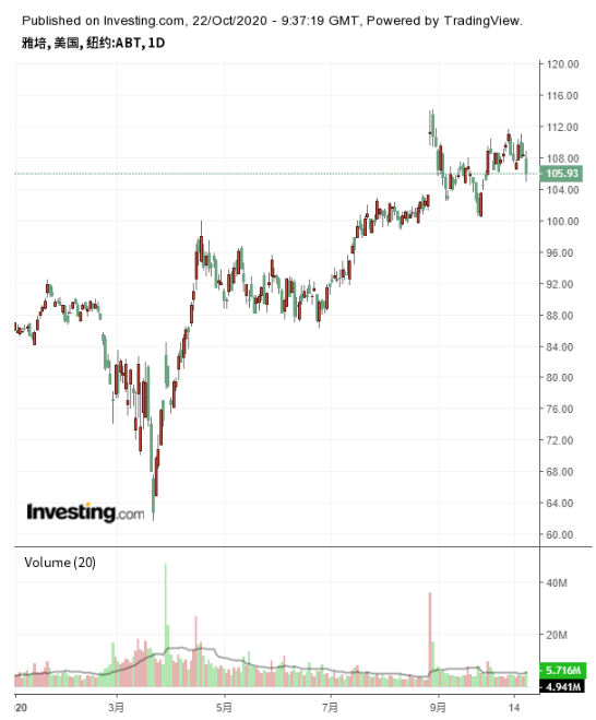 雅培周三在公布财报之后下跌了逾2%,鉴于其卫生事件检测业务的潜力尚未被完全计入到股价中,其后市预计会有更大的上涨空间。