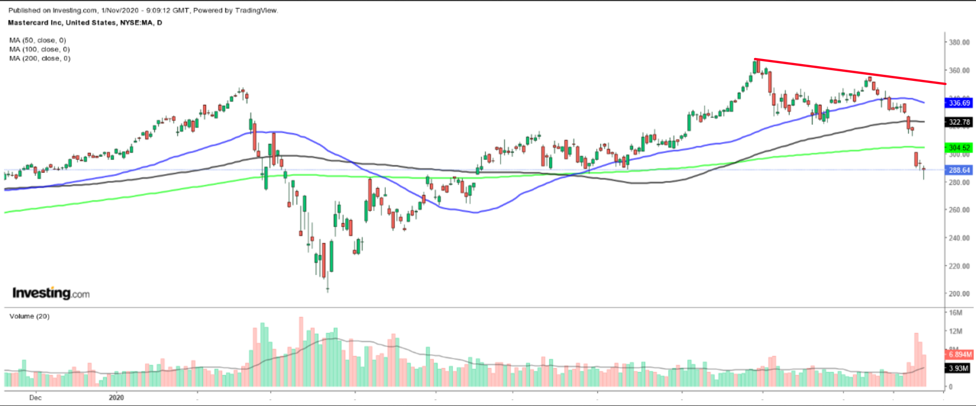 从技术角度看,万事达股价近几日已经跌破50日、100日和200日移动均线,这通常预示该股后市还会进一步下跌,考虑到这些因素,未来几天该股仍会承压。