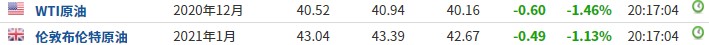 截至发稿,WTI原油跌1.46%,报40.52美元/桶。布伦特原油跌1.13%,报43.04美元/桶。