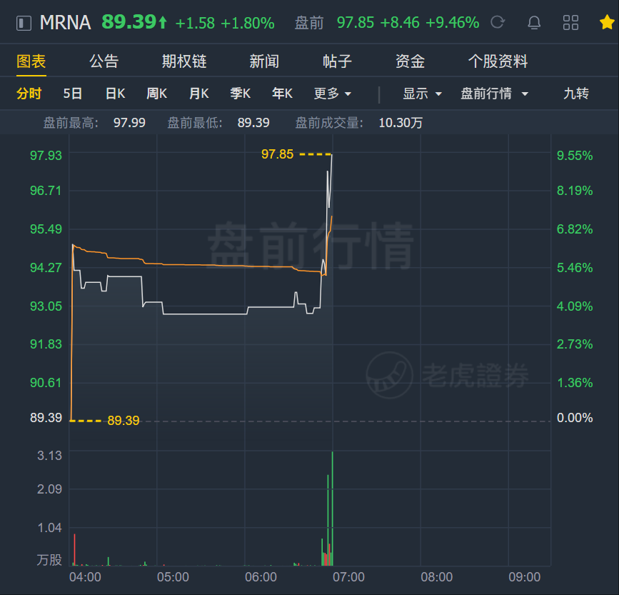 11月16日,美国药企Moderna盘前涨近10%,公司表示三期试验疫苗有效性为94.5%。