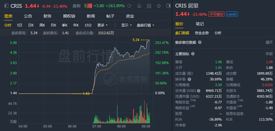 12月8日讯,抗癌药公司居里公司盘前涨超260%,此前公司公布关于CA-4948单药治疗复发或难治性急性髓系白血病和骨髓增生异常综合征患者的一期研究的初步数据。