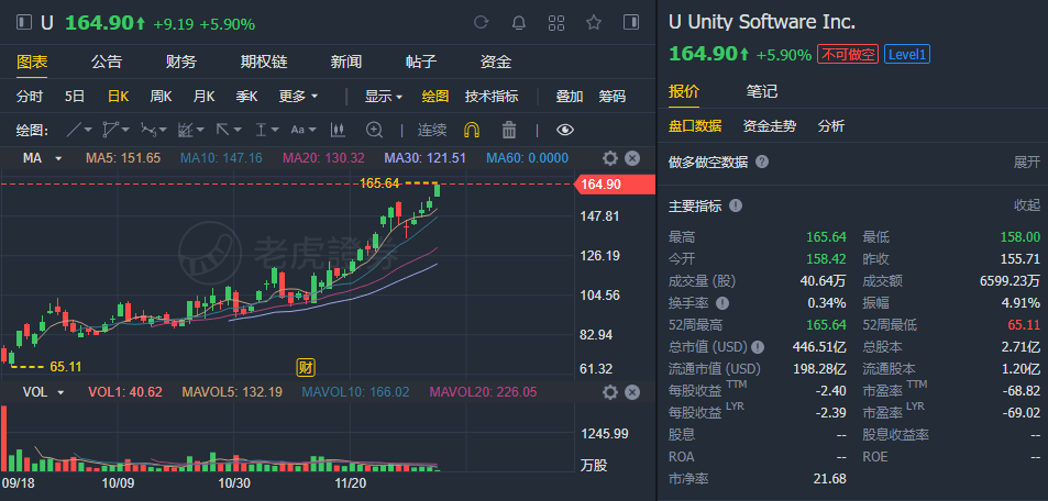12月8日美股盘初,Unity Software Inc. 涨超5%,盘中股价创新高。Unity Software在IPO招股说明书中表示,公司估计目前市面上超过50%的手机、PC与主机游戏都是使用Unity游戏引擎制作的,包括《决胜时刻M》、《Free Fire-我要活下去》、《无尽对决》、《炉石战记》、《符文大地传说》、《Fall Guys:终极淘汰赛》,以及近期即将正式上市的《英雄联盟:激斗峡谷》等游戏。Unity游戏引擎的最大直接竞争对手就是Epic Games的Unreal游戏引擎。