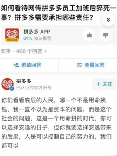近日,有网友爆料称,一名供职于拼多多旗下多多买菜业务的23岁女员工在凌晨1点下班的路上猝死。针对此事,今早8时许,拼多多知乎官方账号突然发布一则言论,引发争议。