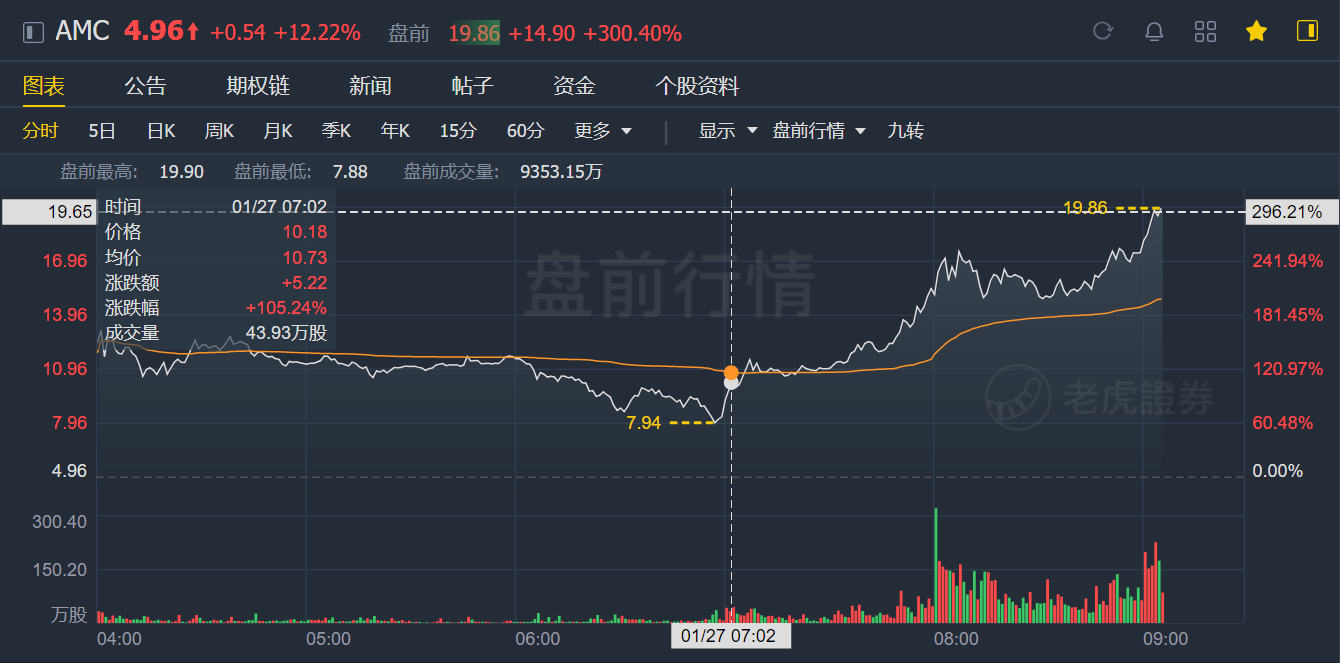周三美股盘前,AMC院线持续疯涨,现涨超300%,股价逼近20美元关口。