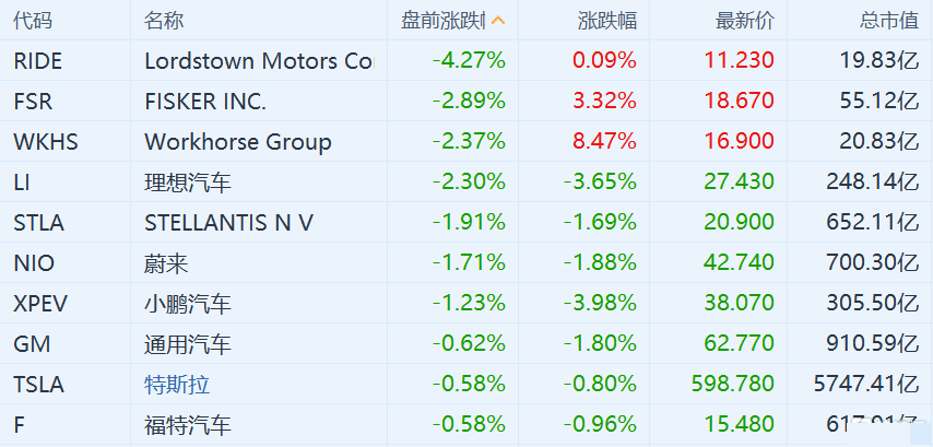 理想汽车跌2.3%,蔚来跌1.7%,小鹏汽车跌1.23%,通用汽车跌0.62%,特斯拉和福特汽车得0.58%。