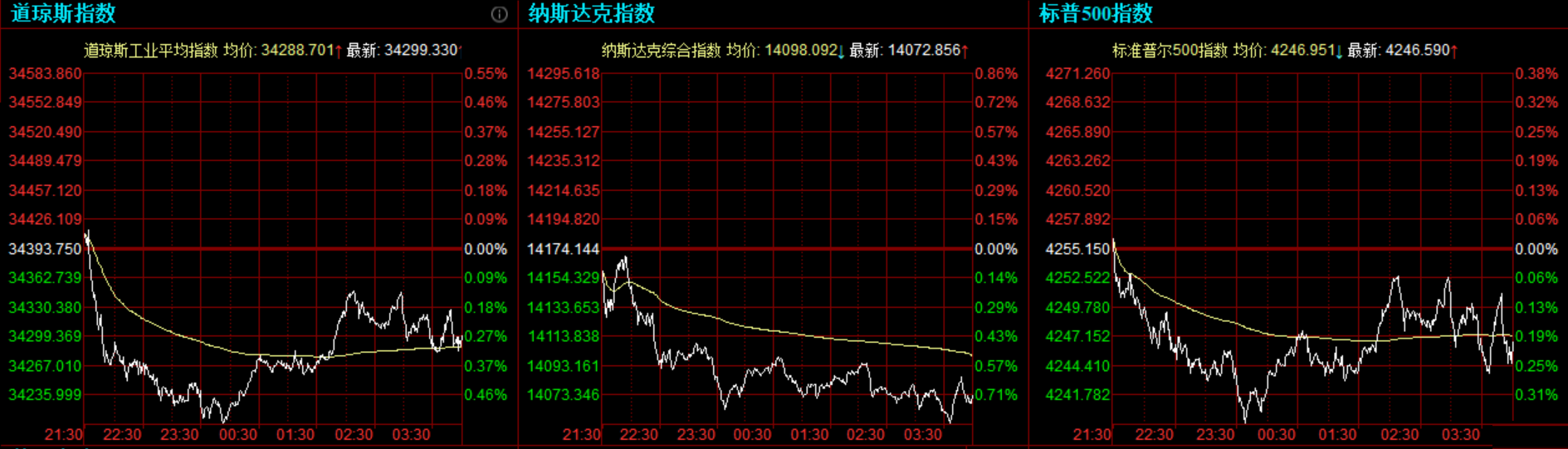 道指收跌94.42点,或0.27%,报34299.33点;纳指跌101.29点,或0.71%,报14072.86点;标普500指数跌8.56点,或0.2%,报4246.59点。