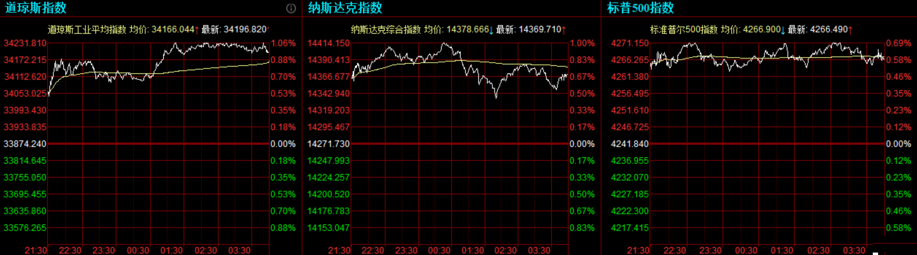 道指收涨322.58点,或0.95%,报34196.82点;纳指涨97.98点,或0.69%,报14369.71点,最高上涨至14414.46点;标普500指数涨24.65点,或0.58%,报4266.49点,最高上涨至4271.28点。