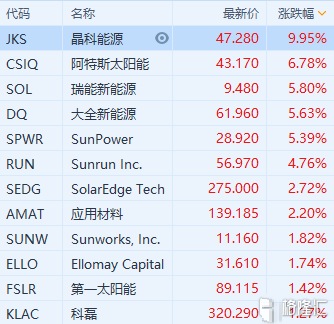 【盘面实况】美股光伏概念全线上涨 晶科能源涨10%