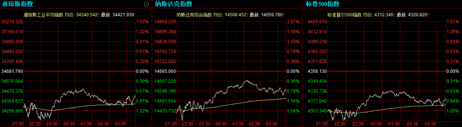 道指收跌259.86点,或0.75%,报34421.93点;纳指跌105.28点,或0.72%,报14559.78点;标普500指数跌37.31点,或0.86%,报4320.82点。
