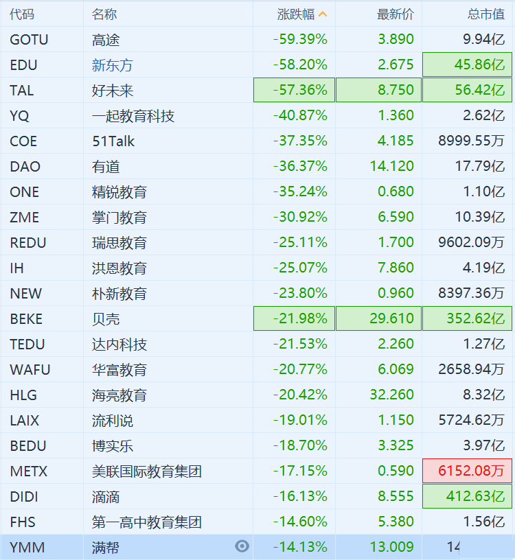 高途跌59%,新东方跌58%,好未来跌57%,有道跌36%,贝壳跌21%,滴滴跌16%,36氪跌12%,雾芯科技跌近10%,富途、每日优鲜跌超9%,叮咚买菜、红黄蓝、BOSS直聘跌超8%,拼多多、网易、理想汽车跌超5%,阿里巴巴、京东、小鹏汽车跌超4%。