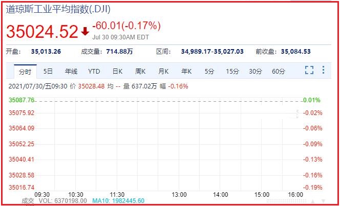 美股三大指数集体低开,纳指跌1.1%,道指跌0.24%,标普500指数跌0.65%。大型科技股下挫,亚马逊跌超7%,公司此前被欧盟处以创纪录的7.46亿欧元罚款。热门中概股多数走低,阿里巴巴跌超3%。