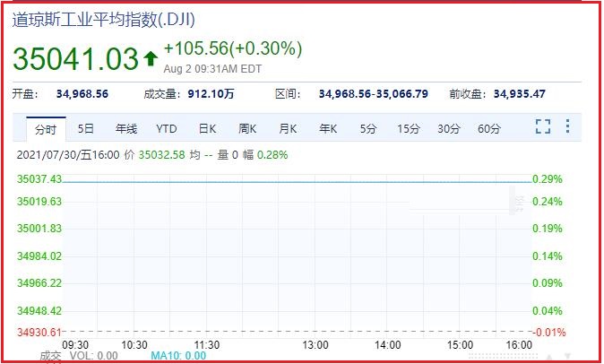 1,截止发稿时间,道琼斯报于35092.40,成交量,1233.77万